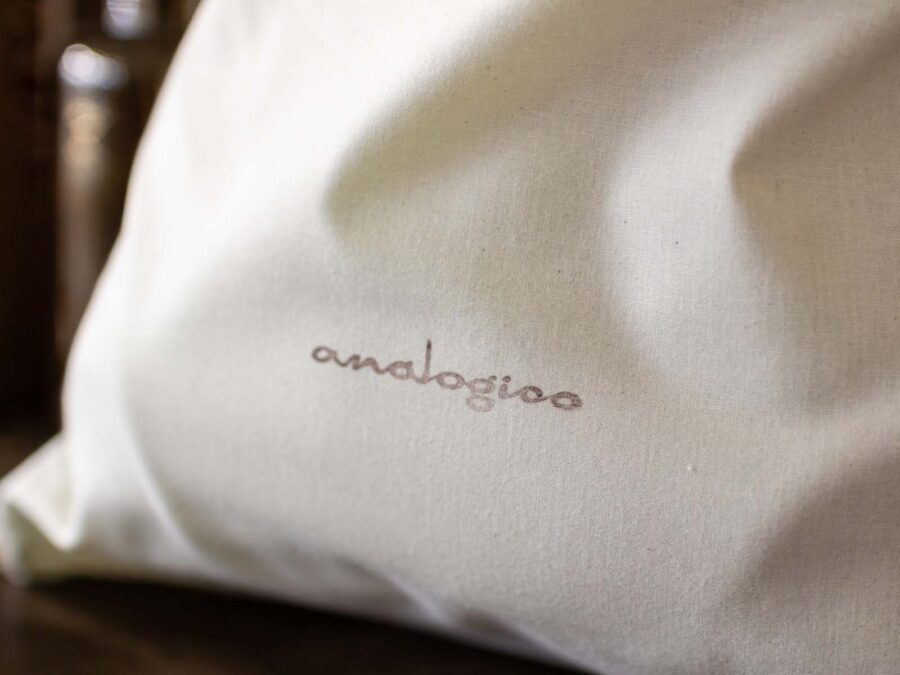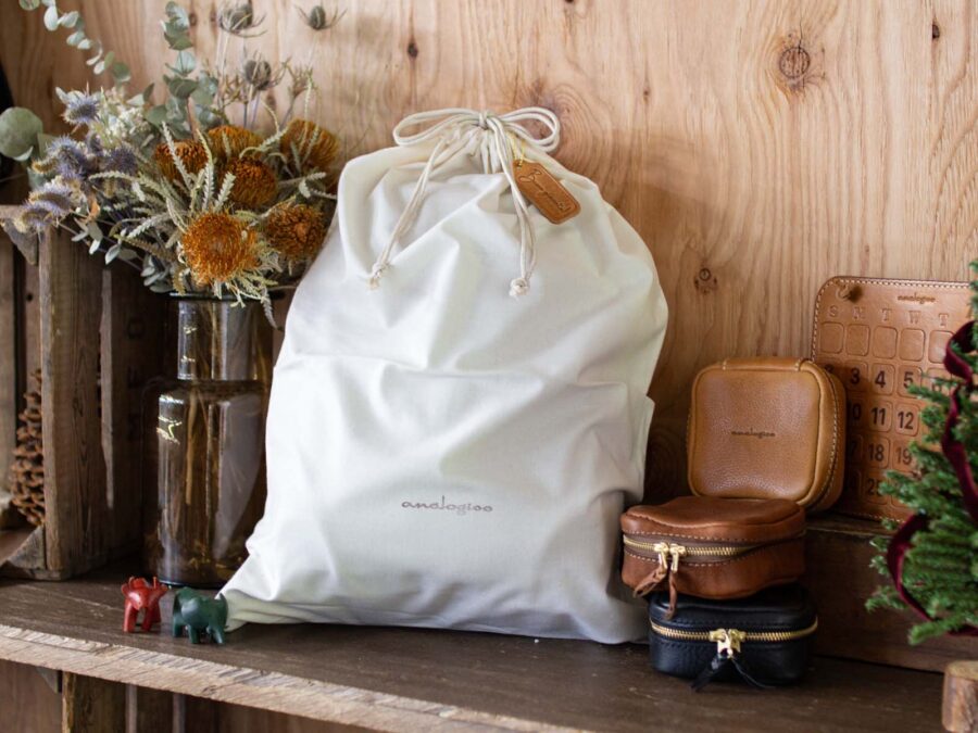 イタリアンレザーを使ってバッグや革製小物を製作販売されておられるanalogico様 https://analogico.jp/ からのご依頼で販売品のラッピング用の巾着を作らせていただきました。